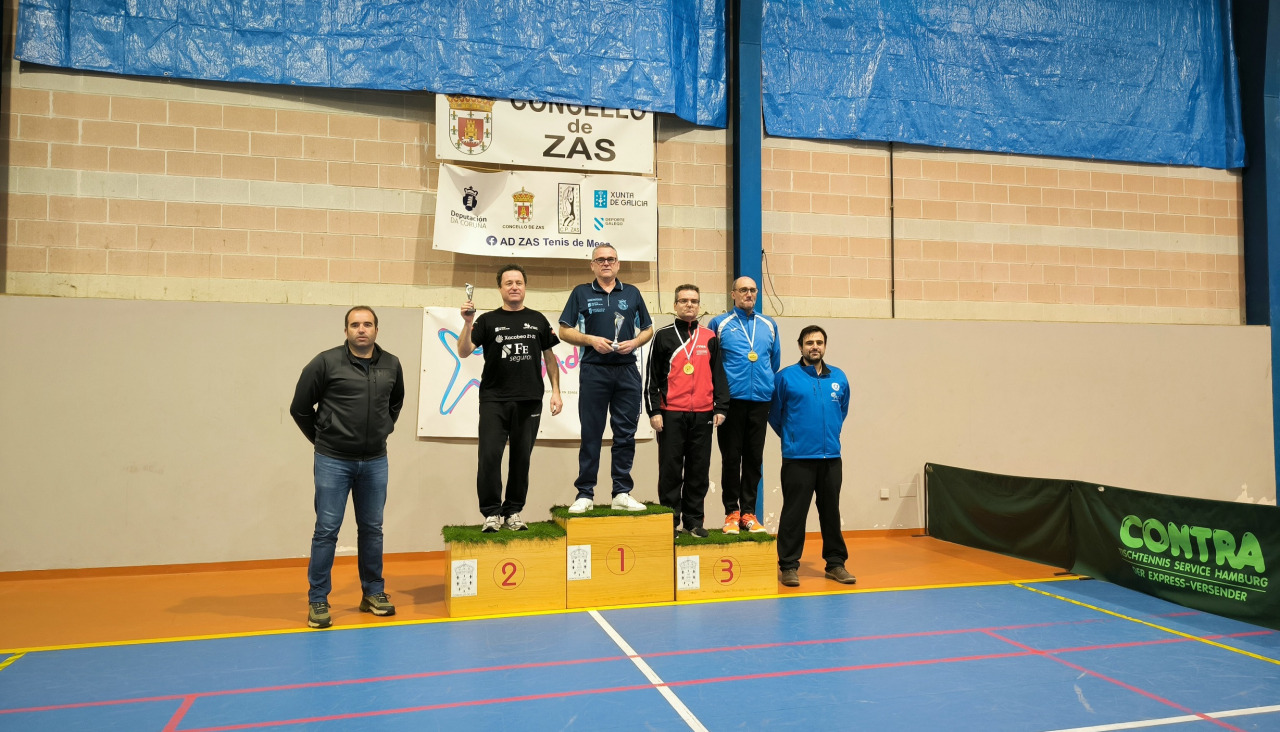 En la categoría de veteranos 50, el cambadés Najo Padín se proclamó campéon autonómico al vencer en la final al vilagarciano José Luis Recuna, que se proclamó subcampeón autonómico. Su compañero del Vilagarcía TM, Joaquín Carlos Costa, se subió al podio también tras llegar a las semifinales en Zas. En la categoría de veteranos 60, otro vilagarciano, Gonzalo Recuna, llegó a la final y fue subcampeón jugando para el Arteal al perder la final con José Ramón Fernández Cora, del Tenis de Mesa Calvario.