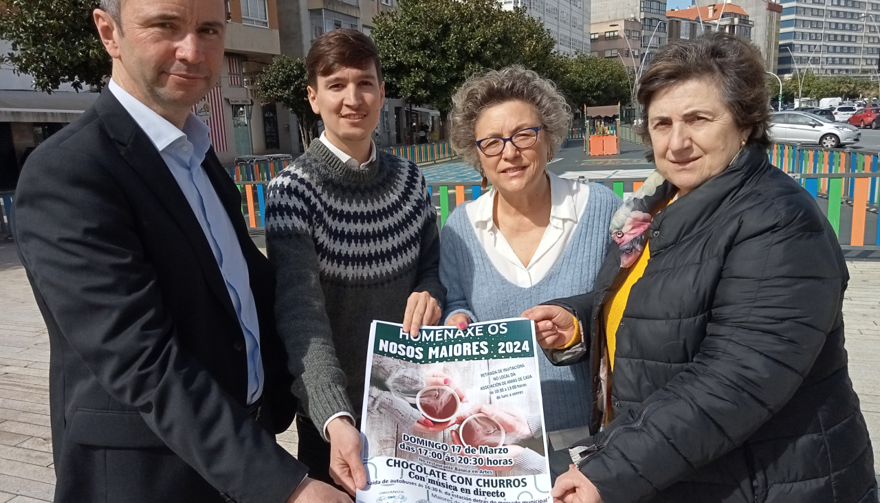 El salón de eventos Baiuca, situado en el lugar de Goda, en la parroquia ribeirense de Artes, albergará este domingo, día 17 de marzo, entre las cinco y las ocho y media de la tarde, el tradicional Homenaxe aos nosos maiores que desde hace un par de décadas organiza la asociación Amas de Casa de Ribeira y en el que, además de servirse chocolate con churros, se contarán con la actuación en directo del grupo local Leite con Jalletas para amenizar el baile. Para facilitar el desplazamiento a los asistentes, se fletarán autobuses, que empezarán a salir desde media hora antes del inicio del evento de la parada central del Malecón, situada en las inmediaciones del mercado municipal. Así lo dio a conocer esta mañana su presidenta, Puri Cores, que estuvo acompañada de la directiva Pili Doval, así como del alcalde, Luis Pérez, y del concejal de Servizos Sociais, Vicente Mariño.