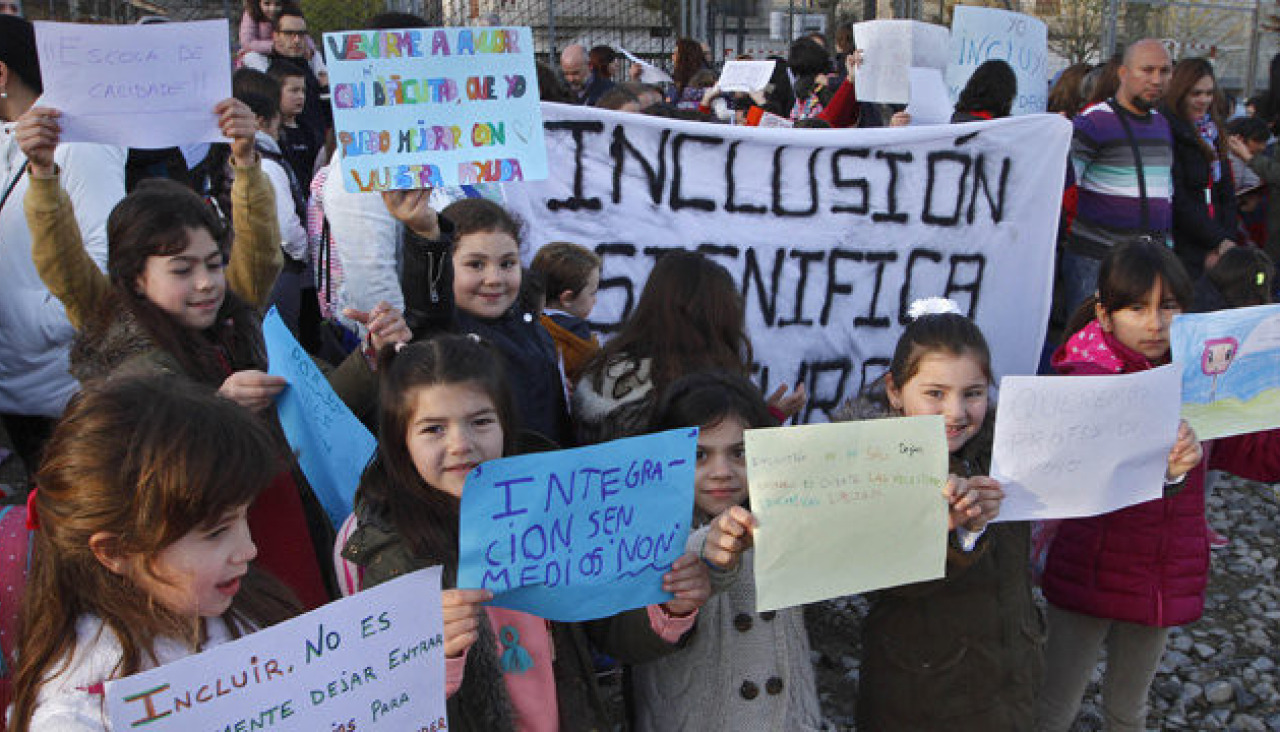 “Inclusión significa recursos”, explican los padres, que ayer se movilizaron en masa con pancartas y carteles que hacían especial hincapié en los alumnos con necesidades especiales y en la situación en que se encuentran por la falta de profesores de apoyo.